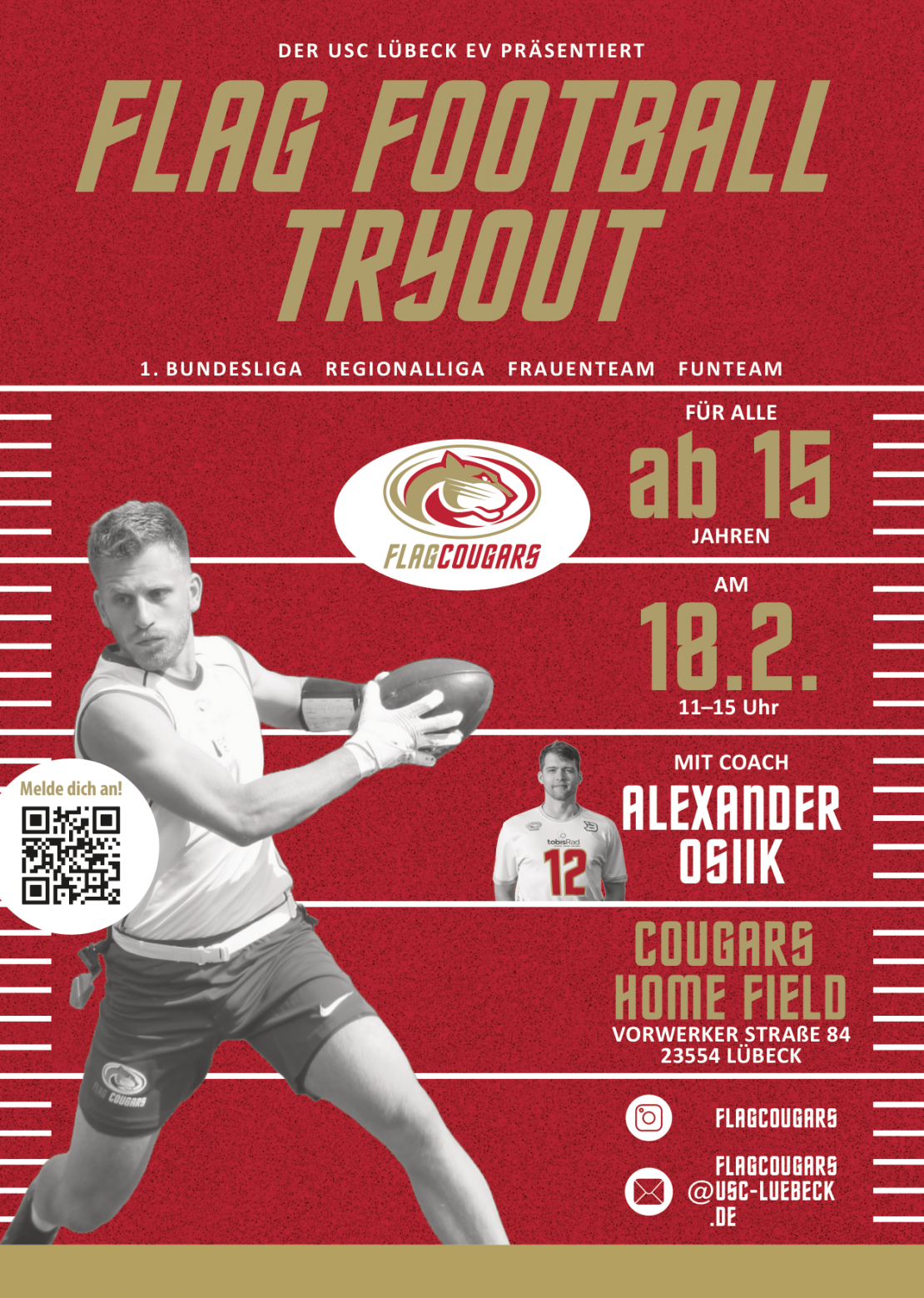 Für weitere Informationen zur Anmeldung und zum Ablauf des Tryouts können Interessierte den Instagram Account (@flagcougars) direkt per E-Mail (flagcougars@usc-luebeck.de) Kontakt aufnehmen.